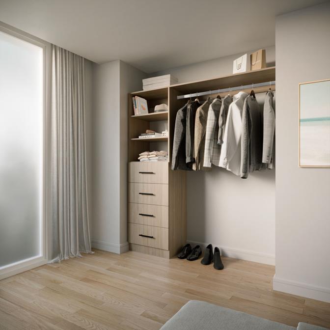 Choose from four on-trend colours and nine handle options. The reversible design adapts seamlessly to your space. With four drawers, adjustable shelves, and spacious long hanging, it's perfect for your long dresses, suits and more. Elevate your storage with Galleria BIR4.9.
