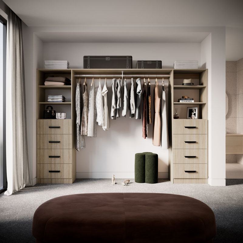 Featuring eight drawers, adjustable shelves, and versatile hanging space, it suits all your wardrobe needs and fits well in wider and larger wardrobe openings. Perfect for accommodating the belongings of two individuals, this wardrobe is your go-to storage solution.